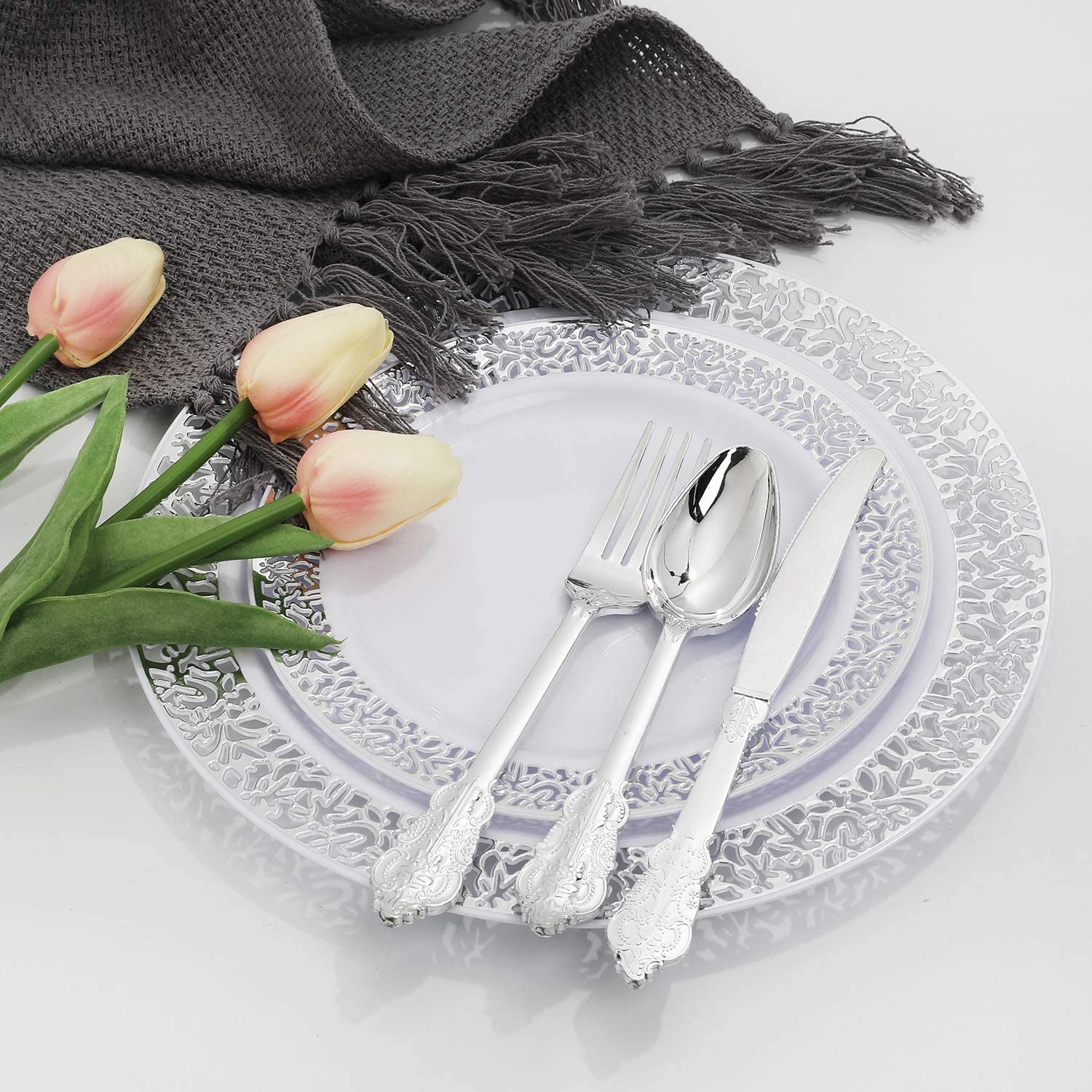 - HEALTHY MATERIAL: Silver plastic plates with lace design are made of BPA free, non-toxic and 100% food grade material.