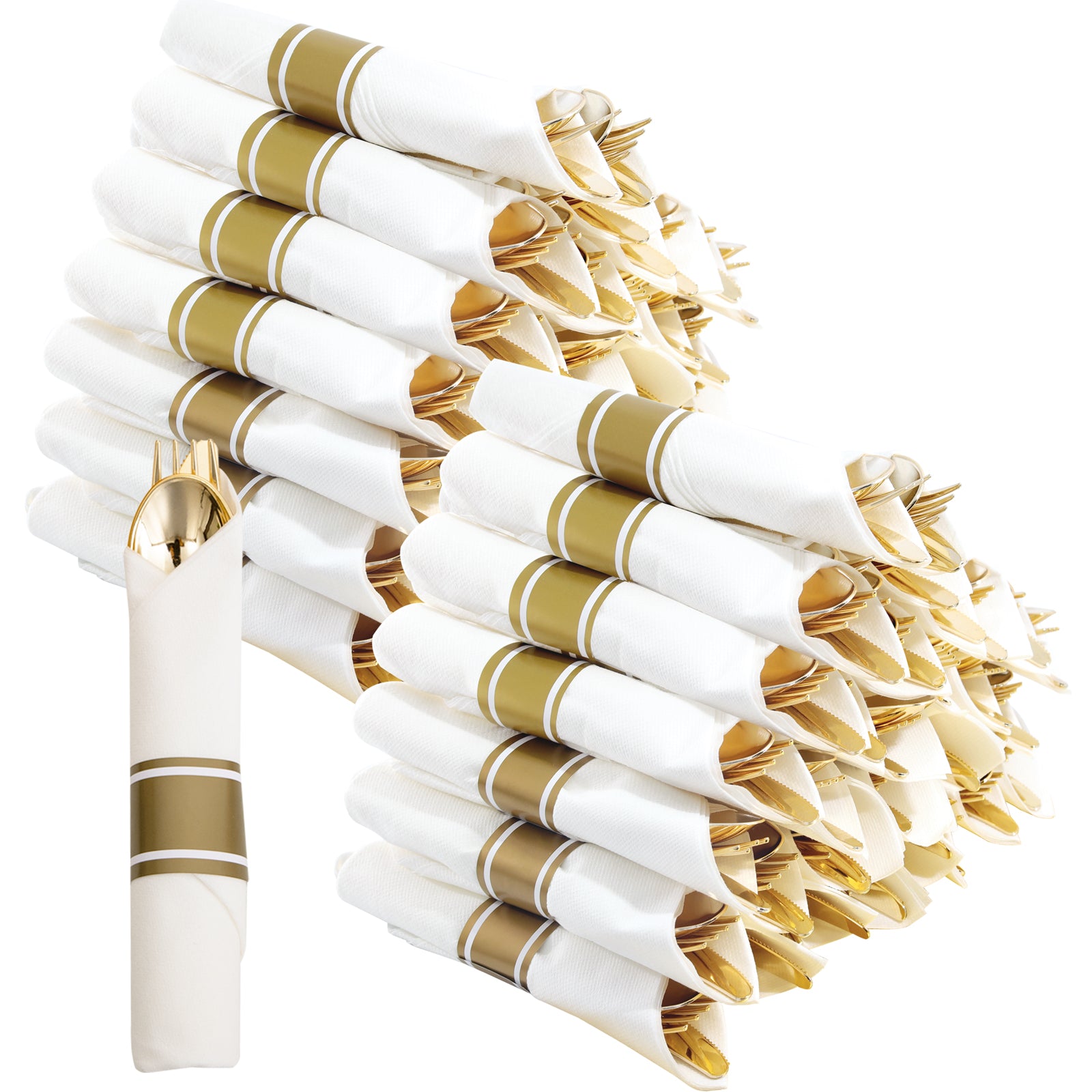- 【Strong and Durable】This prerolled napkin cutlery set is crafted of food grade materials. The gold disposable utensils are not easy to break or bend during use, allowing you and your guests to cut through even tough and dense food with confidence. Pre wrapped silverware and napkin can make it easy to clean the corners of your mouth during and after meals.