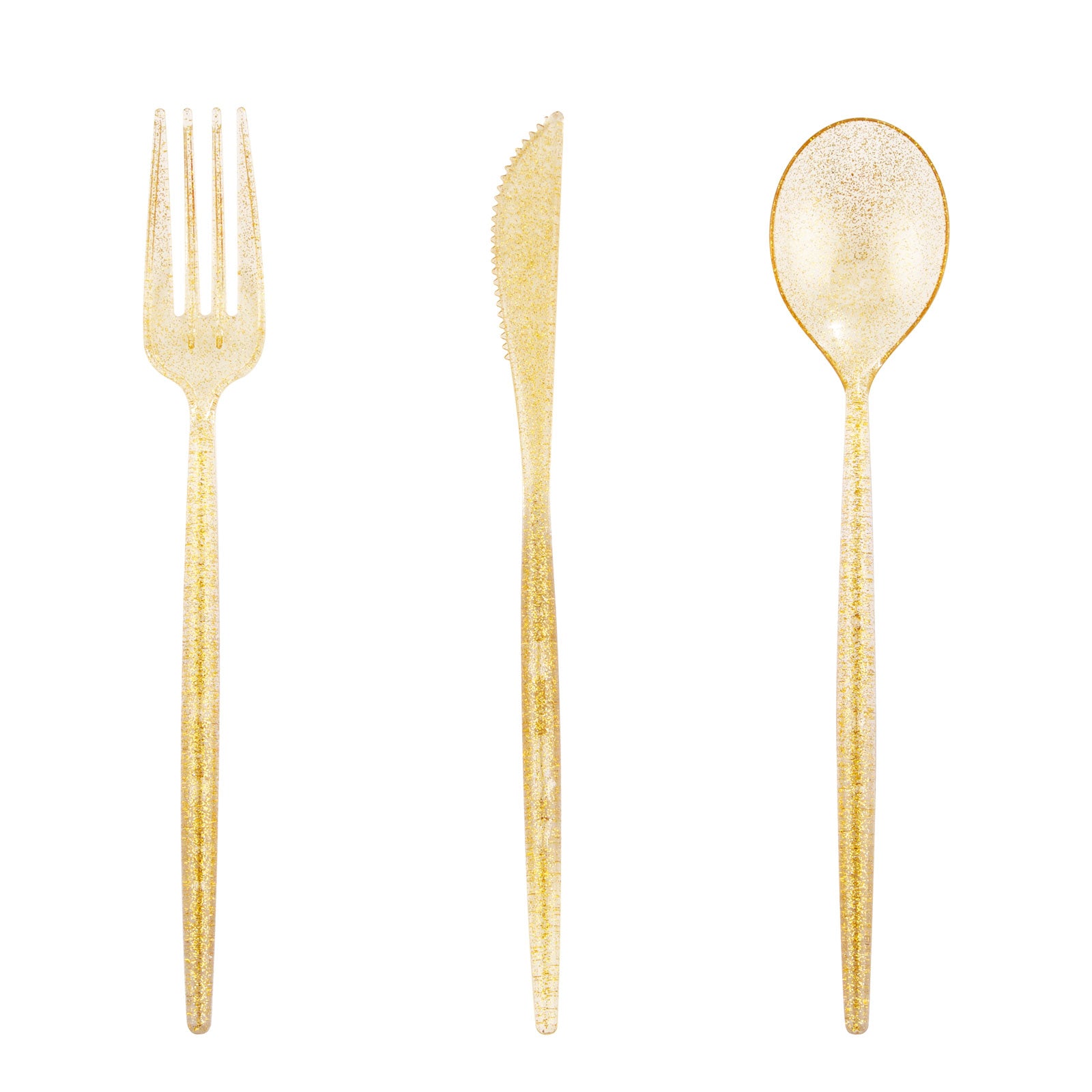 - New Color: The gold glitter plastic silverware are very shine and looked like crystal with gold in. The clear with gold glitter cutlery can match to all kind of gold plastic plates.