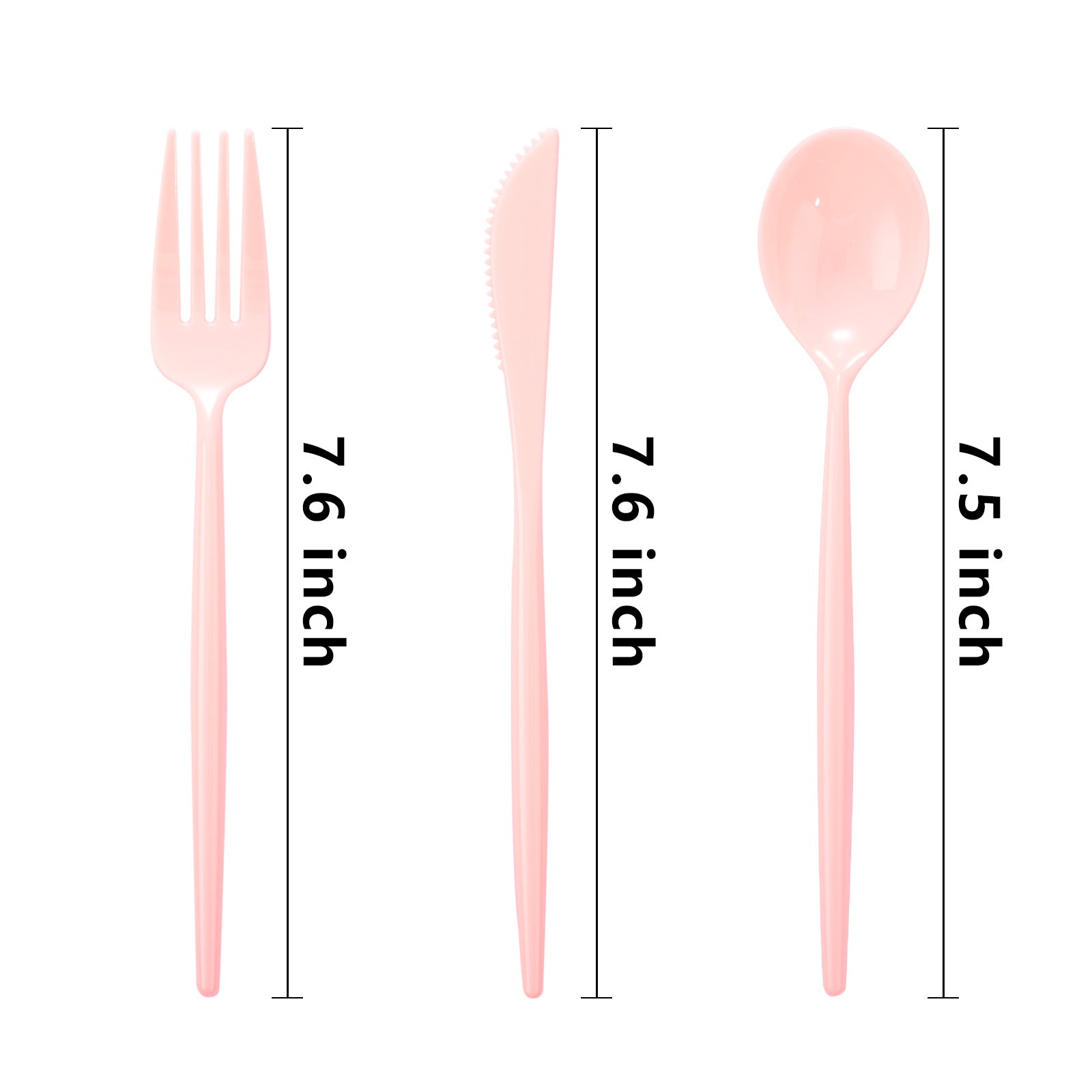 - [Durable Plastic Silverware]-Pink plastic silverware include 7.6 inch 60 pink plastic forks,7.6 inch 60 pink plastic knvies,7.5 inch 60 pink plastic spoons which are made of strong and durable plastic.