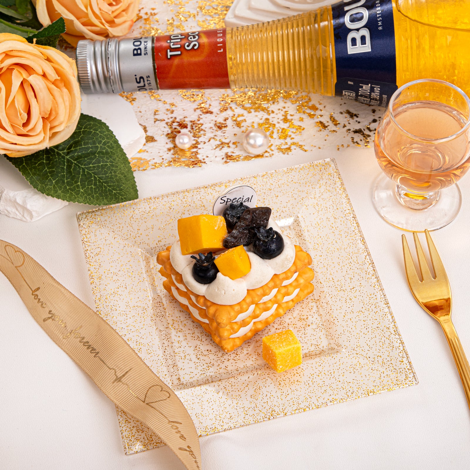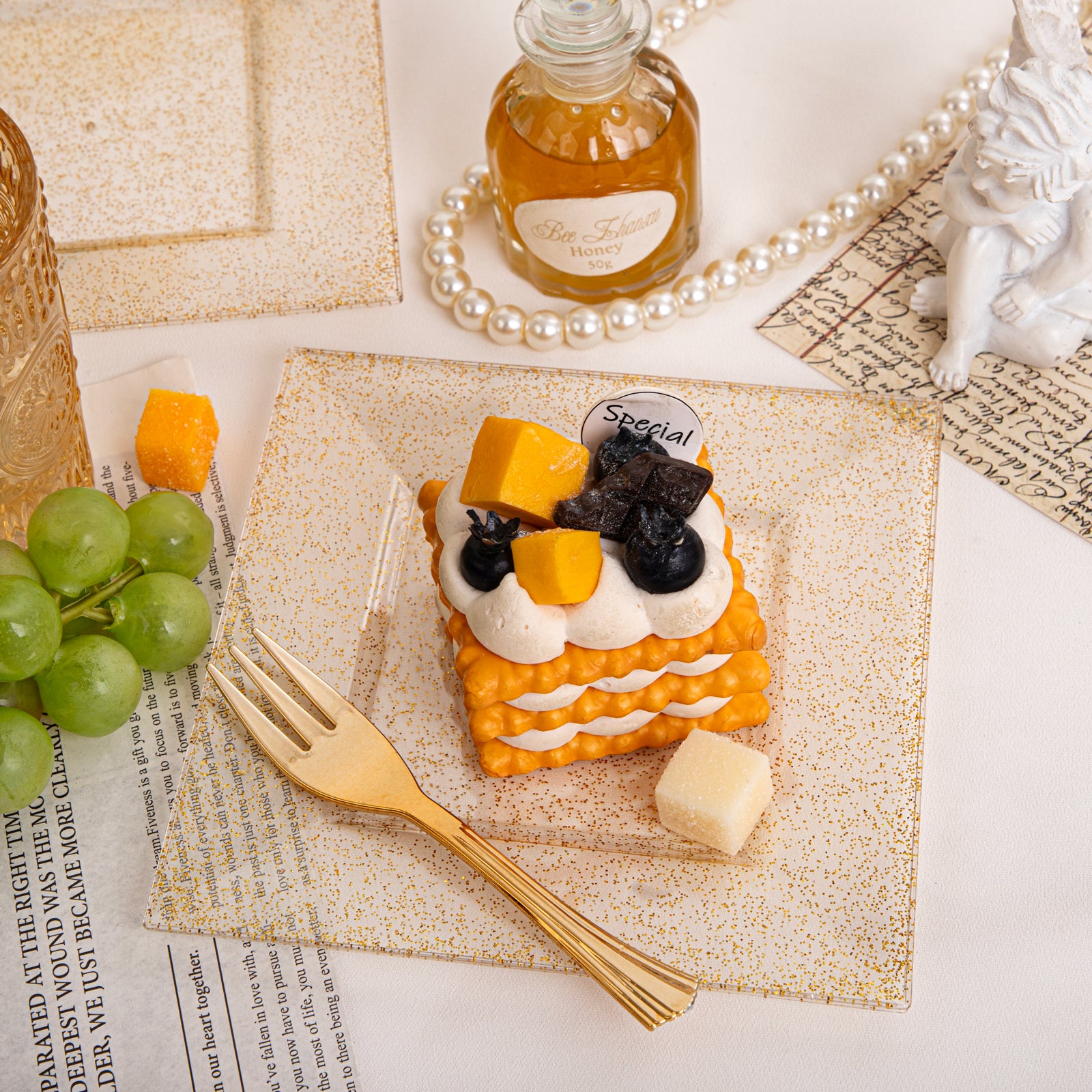 - BEAUTIFUL DESIGN: The square salad plates are simple and modern design with the gold glitter color which are seemed shine and different to the normal plastic plates. The gold plastic forks are match well with gold dessert plates.