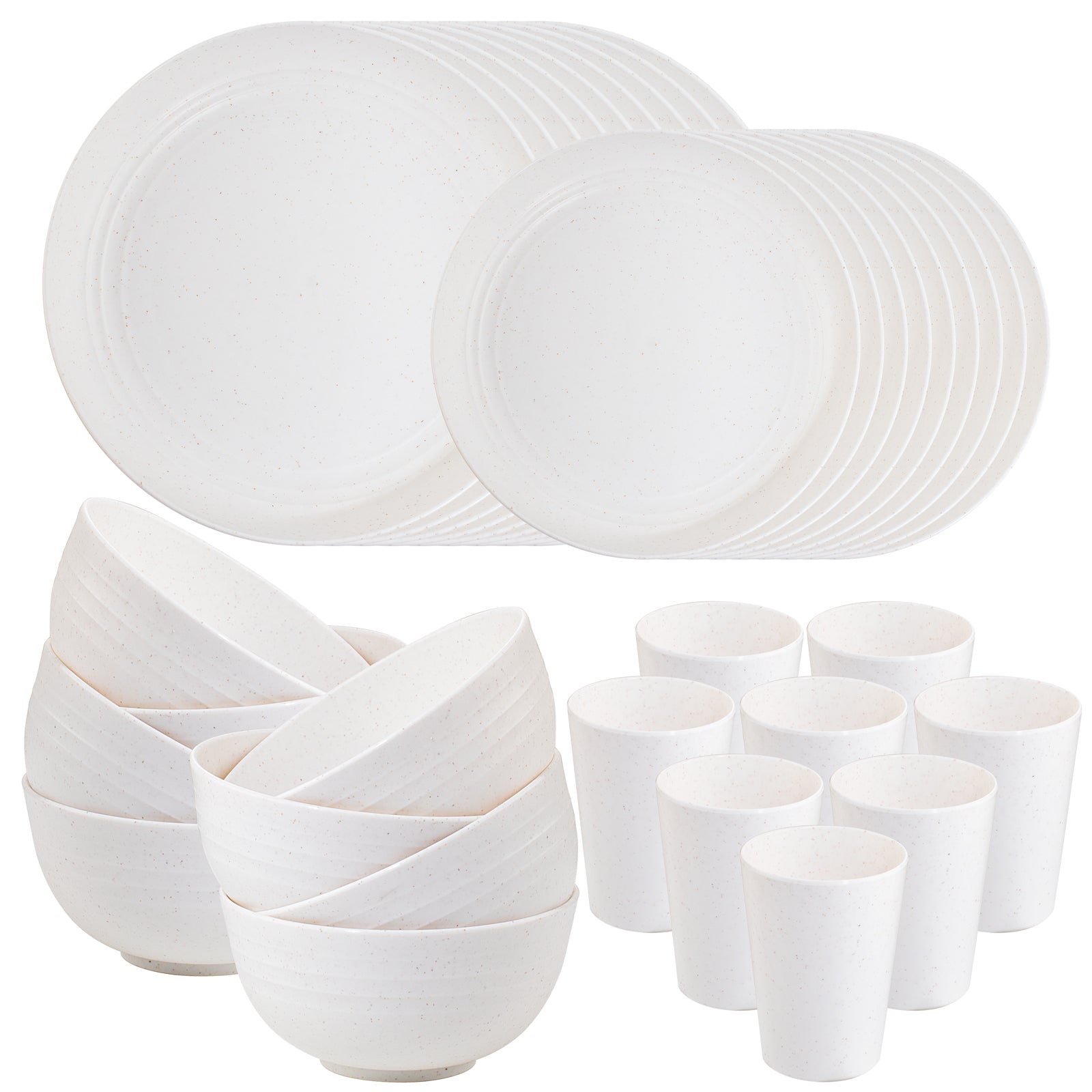 - VALUE PACKAGE INCLUDED:This wheat straw dinnerware sets served for 8, the white plastic dinnerware sets are reliable choice for both daily use and special occasions. Plates and bowls sets contains 8pcs dinner plates, 8pcs dessert plates, 8pcs cereal bowls and 8pcs drinking cups included.