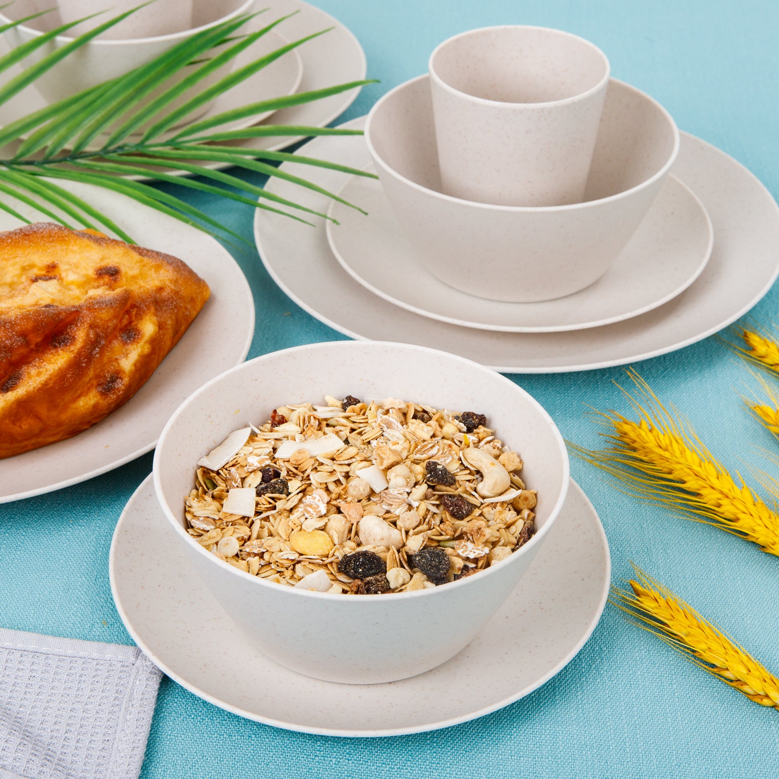 - VALUE PACKAGE INCLUDED:This wheat straw dinnerware sets include 8 dinner plates, 8 salad plates, 8 wheat straw cereal bowls, 8 wheat straw cups and 25pcs linen napkins. the classic beige plastic dinnerware sets are reliable choice for both daily use and special occasions.