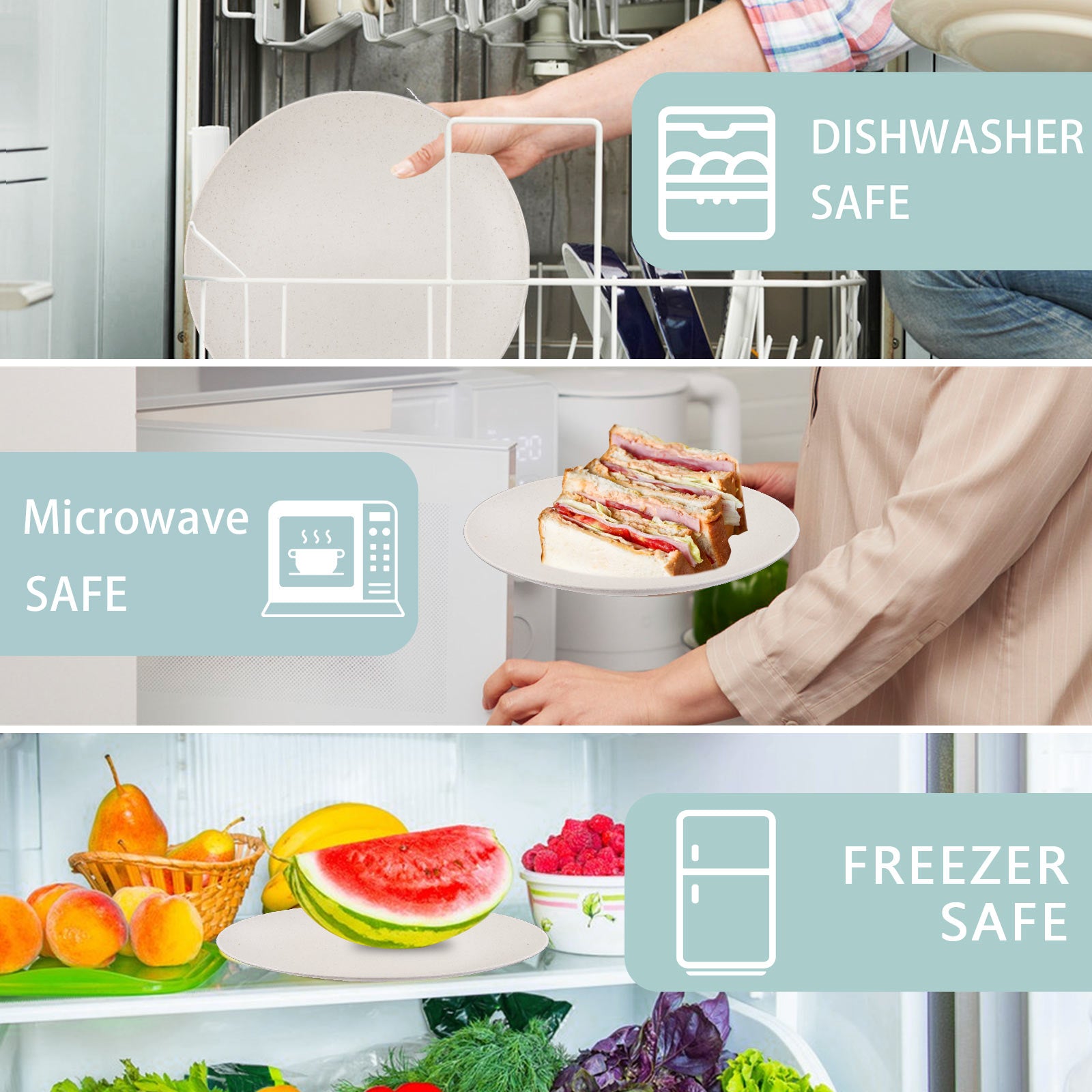 - REUSABLE AND STACKABLE:The unbreakable dinnerware sets are reusable,non-breakable,and designed with space-saving style and smooth round edges, our wheat straw plates are stackable, Stacking keeps your countertop without any mess.