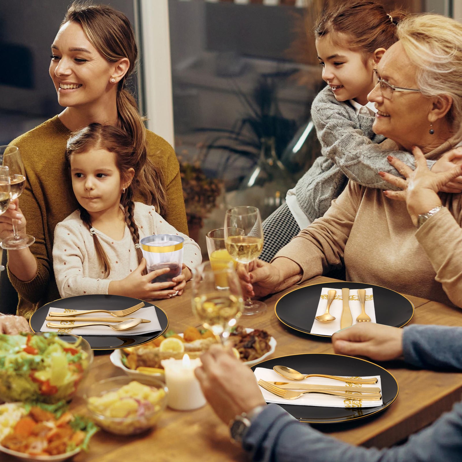 - Healthy: Black and gold plastic dinnerware are made of 100% food grade plastic which is safe and non-toxic. High quality black plates with gold rim offer reliable strength and durability, sturdy and healthy.