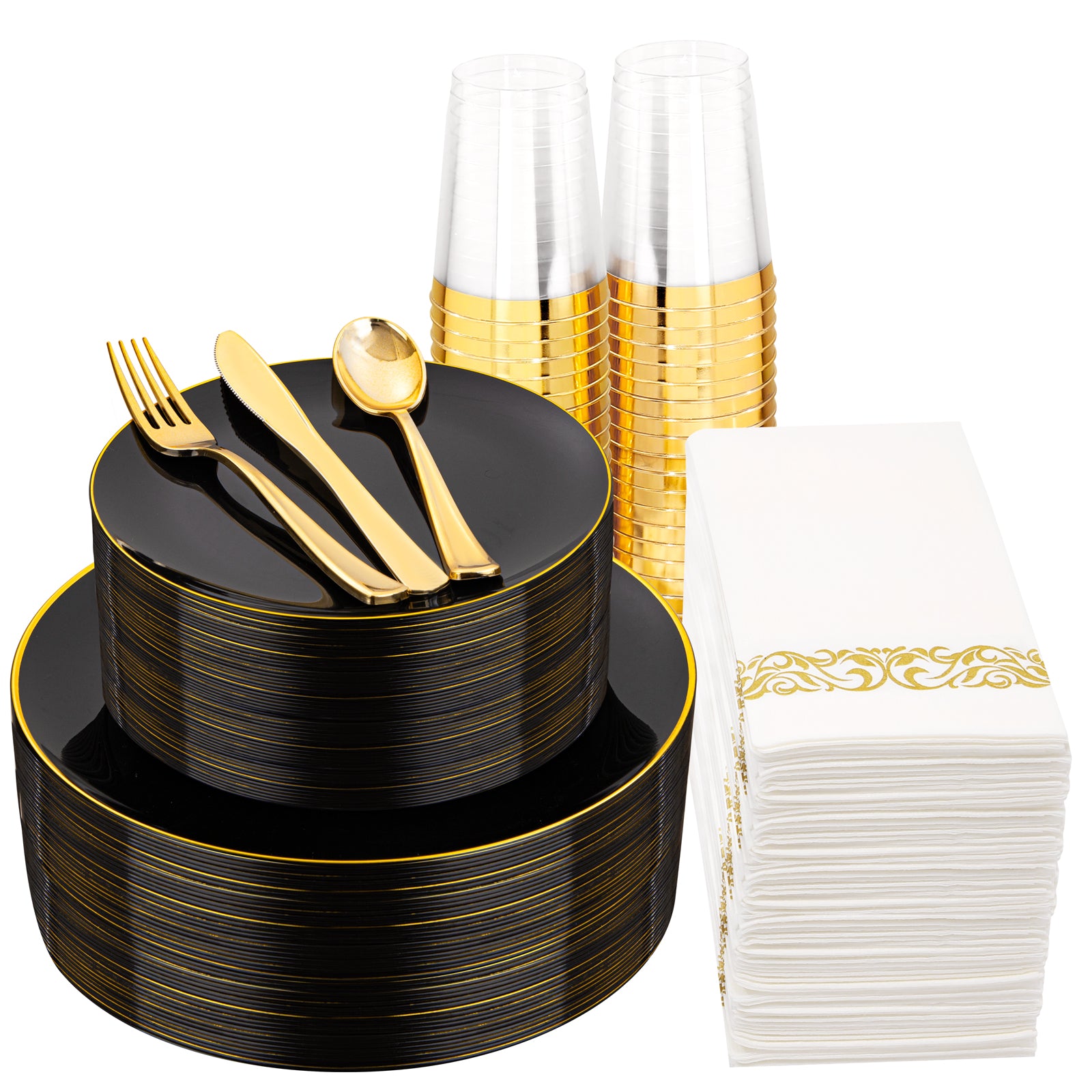 - Value Pack: Black and gold dinnerware set include 50 black plastic plates, 50 dessert plates, 50 gold plastic knives, 50 gold plastic forks, 50 gold plastic spoons, 50 gold napkins and 50 gold plastic cups.Put in a sturdy box which can be gift too.