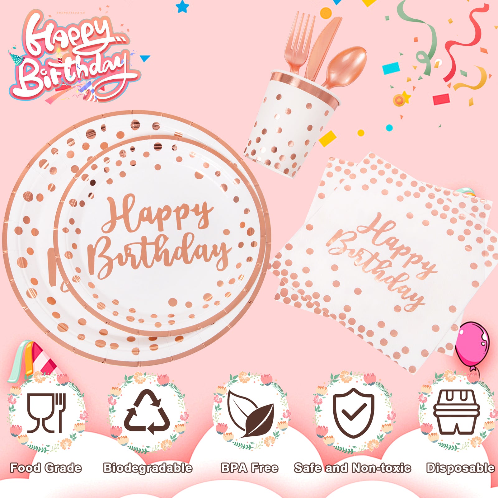 - Happy Birthday Plates Design -The rose gold design of the birthday plates is very elegant and beautiful. Designed with a white background and rose gold foil dot pattern, rose gold plates and napkins party supplies really add impression for your parties.