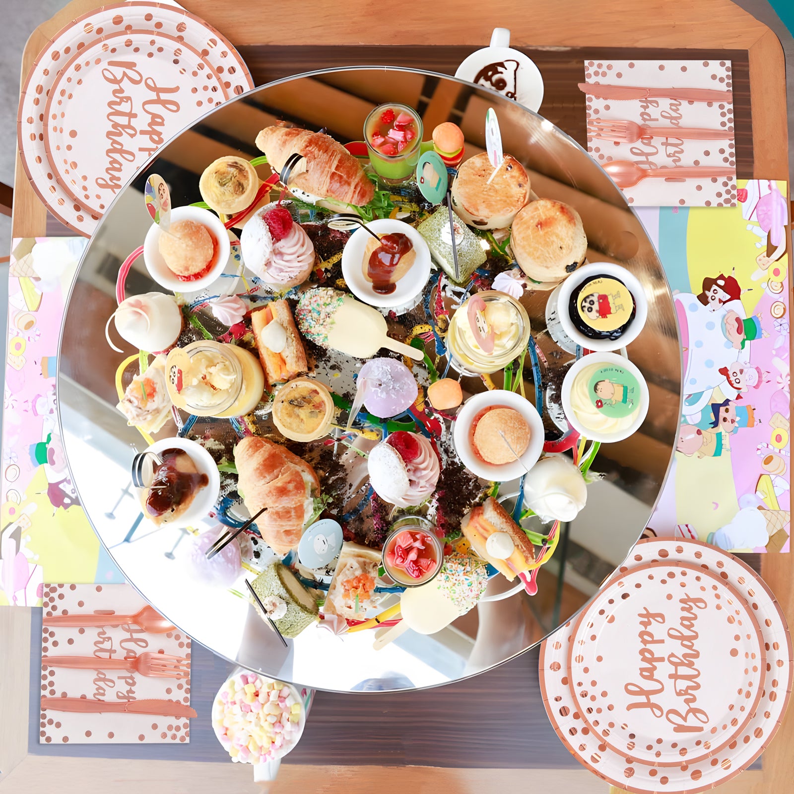 - 350pcs Rose Gold Plates and Napkins Party Supplies -The rose gold party supplies include 50 birthday plates,50 rose gold paper plates,50 happy birthday napkins,50 paper cups,50 rose gold plastic forks,50 knives and 50 spoons,durable rose gold birthday decorations allow you to serves 50 guests at one time.