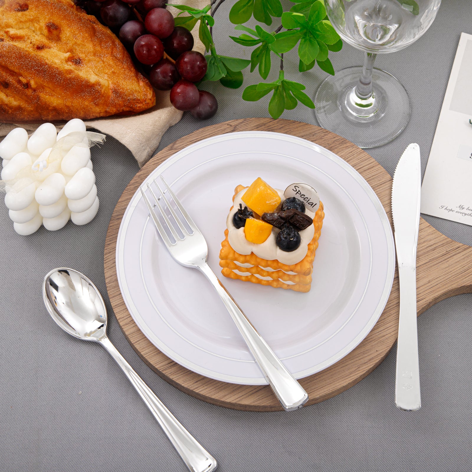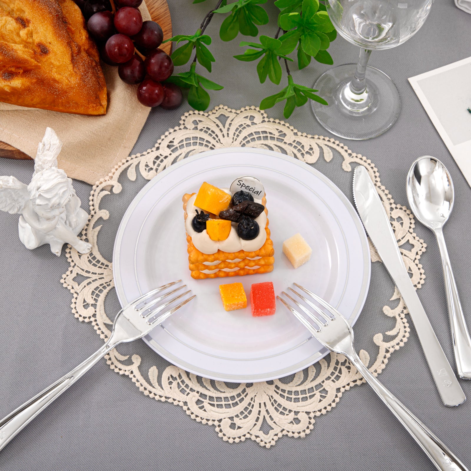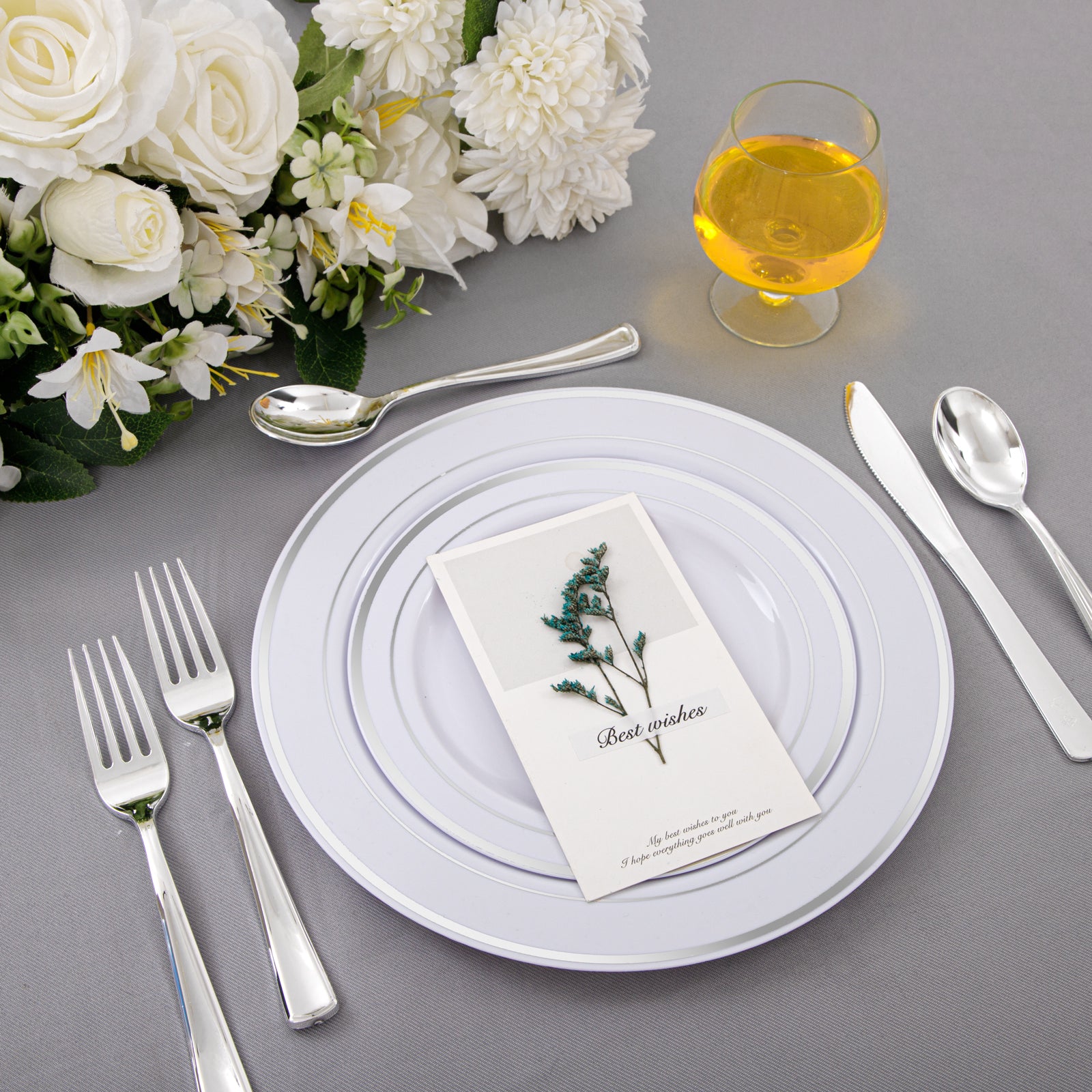 - For Any Occasion: The plastic silverware for parties is great to have for elevating a meal at home or catering events. The silver shine gives the plastic cutlery set an elegant look that is perfect for a reception, banquet, dinner party, or even for wedding silverware.