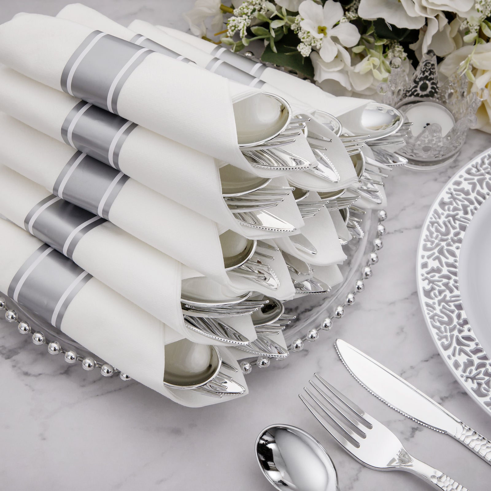 - Convenient Package: This pre-rolled napkin set includes silver plastic cutlery with soft and absorbent napkins for up to 60 people, perfect for weddings, banquets, and holidays.
