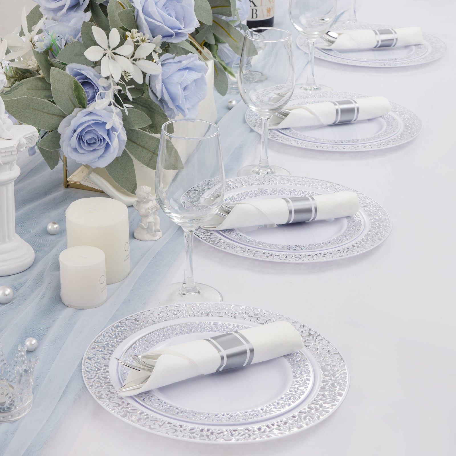 - Elegant Design: The silver finish on these plastic utensils and napkins complement any party theme, while the sturdy and reusable material adds to the upscale feel of your event.